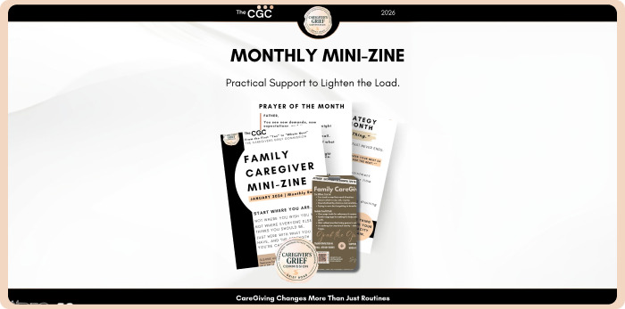 The CareGiver Mini-Zine is our complimentary four-page monthly guide offering practical tools and reflection to help family caregivers reset.